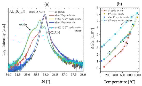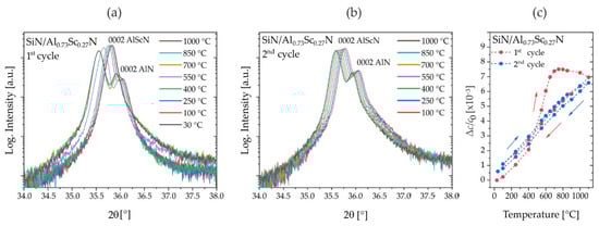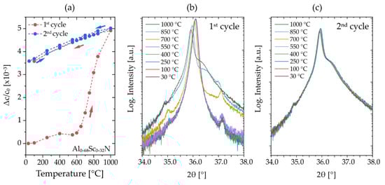 For direct comparison with fiber textured samples from set #1, XRD measurements during two temperature cycles were conducted for the Al0.68Sc0.32N film, Figure 7. The displayed temperature cycle and reflection profiles are highly congruent to the data recorded on the fiber textured thin films with similar composition. An irreversible change of Δc/c0~3.5 × 10−3 remains after annealing at 1000 °C (Figure 7a) and no further changes are observed in the second temperature hysteresis, congruent with the measured reflection profiles shown in Figure 7b,c.