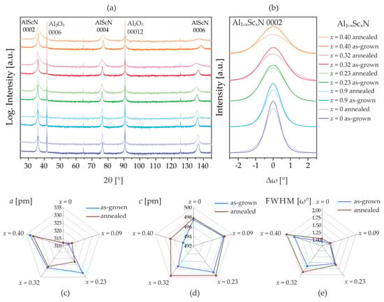 Analysis of Al1−xScxN/Al2O3 (0 ≤ x ≤ 40.0) before and after in situ thermal annealing (sample set #2). (a) XRD 2θ/θ diffractograms. (b) XRD rocking curve measurements of the 0002-reflections. Summary of changes in lattice parameters a (c) and c (d) calculated from symmetric and asymmetric measurements, ω-FWHM (e) calculated from the XRD rocking curves.