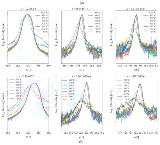 Temperature-dependent changes in symmetric 2θ/θ 0002- and asymmetric ω/2θ 10–15-reflection profiles for (a) Al0.77Sc0.23N and (b) Al0.60Sc0.40N compositions (sample set #2). 10–15-reflections are measured with shallow (−) and steep (+) angles of incidence ω, see [] for more information on the method.