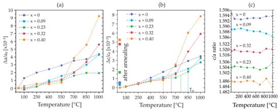 As before, the temperature-dependent changes in the reflection positions are used to calculate the relative thermal expansion of both c and a lattice parameters. The resulting thermal expansion is illustrated in Figure 6. Here, the relative changes in the c and a lattice parameters over the temperature range 25–1000 °C are presented for the investigated films in Figure 6a,b, respectively. In this analysis, the transition between the two expansion regimes is evidenced for all Al1−xScxN compositions but not for AlN. Note that the films are not protected against available oxygen species, hence, intrinsic and extrinsic processes adding to the thermal expansion are superimposed. The transition from almost linear and low-value expansion at moderate temperatures into large values of expansion at high temperatures is observed for a and c. This expansion of the lattice is isotropic which is visible from the almost constant c/a ratio plotted in Figure 6c. The transition temperature Ttr seems to be related to the Sc content of the film, as well as the magnitude of the expansion. Roughly estimated values from the plots are Ttr850 °C for Al0.91Sc0.09N and Ttr550 °C for Al0.60Sc0.40N films as indicated by the vertical dotted lines in Figure 6b. In detail, the thermal expansion behavior in the low-temperature regime (<550 °C) is highly comparable for all Sc concentrations, in agreement with previous studies within this temperature range []. In strong contrast, the high-temperature regime is characterized by a manifold increase in the expansion, depending on the Sc concentration (up to 8-fold for Al0.60Sc0.40N). After cooling back to room temperature, the lattice parameters show irreversible changes as discussed for Figure 4 and Table 2.