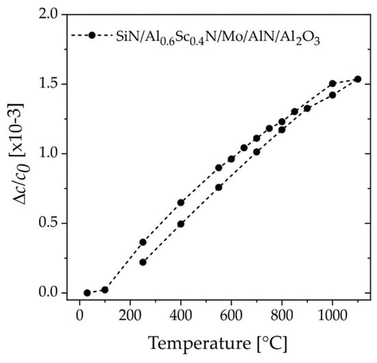 To support the above discussion, we designed a third sample of a SiNx-capped AlScN film with high concentration of Sc x = 0.4 grown epitaxially on a sapphire substrate, i.e., SiNx/Al0.6Sc0.4N(0001)/epi-Mo(110)/AlN(0001)/Al2O3(0001). For such systems, previous work [] demonstrated that the special epi-Mo(110) electrode provides a growth template for AlScN with one-dimensional single crystalline properties and low defect density. The following assumptions are made: First, the SiN barrier should protect the thin film from oxidation and interaction of oxygen species with the internal defect structure at high temperatures. Second, by choosing a high amount of Sc, any effect magnitude is expected to be large. Third, this AlScN thin film exhibits high crystalline quality with an FWHM~0.7° (from XRC) indicating highly oriented columnar grains originating from epitaxial growth and a low defect density. Hence, the effect of any intrinsic, defect-driven anomalous expansion should be strongly limited. Indeed, the recorded thermal expansion during the first temperature cycle shown in Figure 8 shows almost linear expansion featuring no anomalous behavior. This observation, although not expected so clearly, provides supporting evidence for the above hypothesis.
