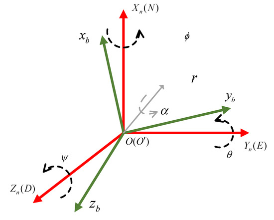 In order to express the attitude, the two coordinate systems shown in Figure 1 are used to represent the carrier coordinate system and the navigation coordinate system . Among them, the carrier coordinate system adopts the front-right-down coordinate system that conforms to the right-hand rule: the x-axis points to the front of the carrier, the y-axis points to the right side of the carrier, and the z-axis points to the carrier vertically downward. The navigation coordinate system adopts the general North East Down (NED) coordinate system.