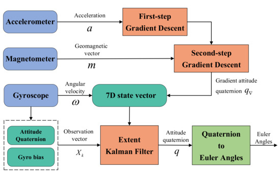 With the increasing requirements for system stability and reliability, it is necessary to control the internal data noise of the system [14,15]. Since the Kalman filter is a method derived for the purpose of minimizing the mean square error in the process of estimating the state of the linear system, it has been widely used [16,17], especially in the field of attitude calculation [18]. Sabatini et al., proposed a quaternion-based extended Kalman filter for human body attitude tracking [19]. The accelerometer and magnetometer were used as state vectors to construct the Kalman filter. In Ref. [20], the magnetic disturbance and gyroscope bias error are modeled as the state vector of the filter, and the measurement model is linearized by calculating the Jacobian matrix. However, the standard extended Kalman filter must linearize the process model or measurement model, which inevitably introduces linearization errors. In addition, the extended Kalman linearization process increases the amount of calculation of the microcontroller.