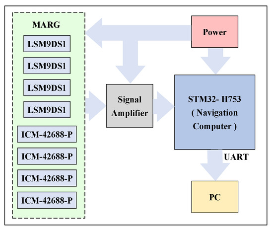 In order to verify the effectiveness and accuracy of the proposed attitude measurement method, a measurement device containing MARG sensor is designed. The measurement device integrates four LSM9DS1 modules and four ICM-42688-P modules. LSM9DS1 has three-axis digital linear acceleration sensors, a three-axis digital angular velocity sensor and a three-axis digital magnetometer. ICM-42688-P also has a six-axis inertial measurement function, which together form the MARG sensor system. The MARG sensor system can be driven in different ways, which can fully meet the needs of the measurement device for the adaptability and stability of different environments. In addition, the measuring device integrates an STM32H753 microprocessor for data acquisition, transmission and calculation. At the same time, data collection is sent to the PC through the RS-422 communication serial port. MATLAB and HDNT Center can be used for the data analysis and posture calculation. The overall size of the measuring device is about 45 mm ∗ 40 mm ∗ 20 mm, which can be widely used in various environments. The block diagram of the hardware design is shown in Figure 4 and Figure 5 and shows a picture of the designed measuring device.