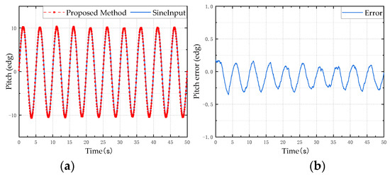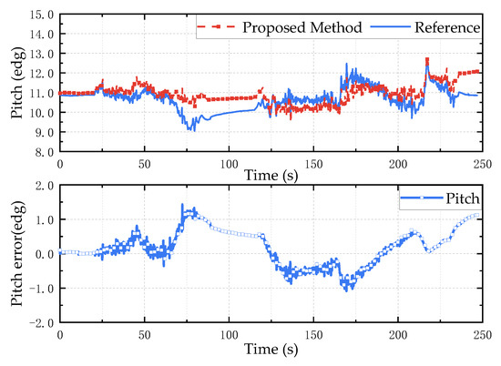 Pitch angle simulation test results: (a) is the estimation result of the proposed method; (b) is the error between the estimated value and the reference value.