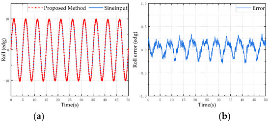 Roll angle simulation test results: (a) is the estimation result of the proposed method; (b) is the error between the estimated value and the reference value.