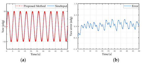 Yaw angle simulation test results: (a) is the estimation result of the proposed method; (b) is the error between the estimated value and the reference value.