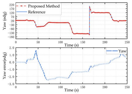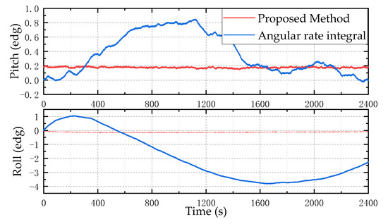 It can be obtained from Figure 9 that due to the existence of the gyroscope zero bias, the error increases and diverges with the angular rate integral. The proposed attitude calculation method can effectively suppress the error caused by the angular rate integral calculation output by the gyroscope.