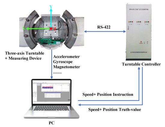 In order to verify the dynamic performance of the proposed Kalman filter, a hardware-in-the-loop simulation platform was built according to Figure 10. A high-precision three-axis turntable was used for verification. By controlling the rotation of the inner frame and outer frame of the turntable, the pitch angle, roll angle, and yaw angle of the measuring device can be simulated. At the same time, the turntable controller can use the RS-422 serial port to realize synchronous position output.