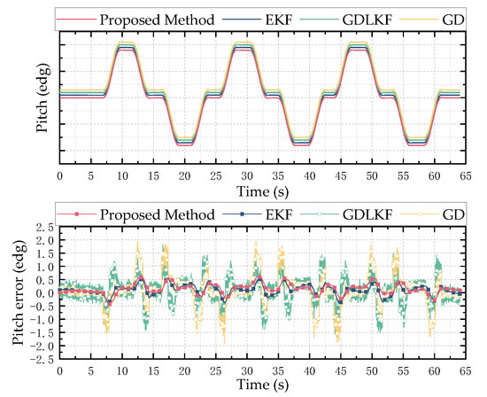 Hardware-in-the-loop simulation test results of pitch angle. The above is a comparison of the estimation results of different methods, and the bottom is the error between the estimated value of different methods and the reference value.