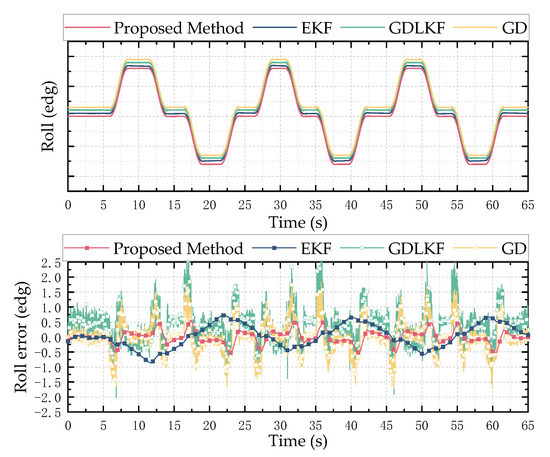 It can be seen from Figure 11, Figure 12 and Figure 13 that the proposed method and EKF can accurately estimate the roll and pitch angles during the test. However, during the rotation of the turntable, the output of the accelerometer is affected by both the acceleration of gravity and the acceleration of the external motion, which result in a relatively large error when the motion state changes suddenly. Relatively, the proposed method in this paper has better dynamic performance than the GDLKF method and GD method.