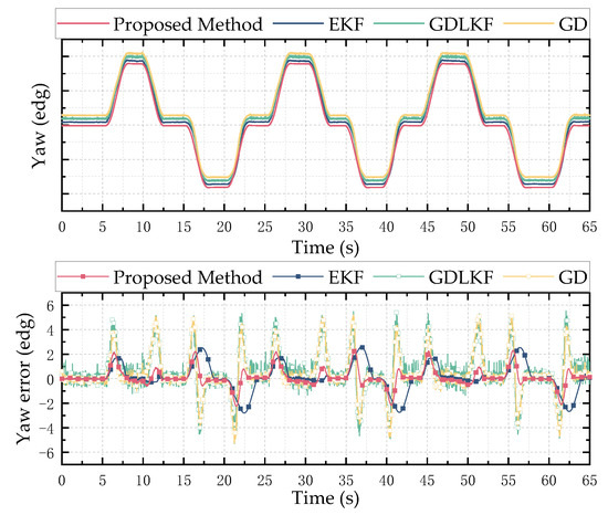 Hardware-in-the-loop simulation test results of yaw angle. The above is a comparison of the estimation results of different methods, and the bottom is the error between the estimated value of different methods and the reference value.
