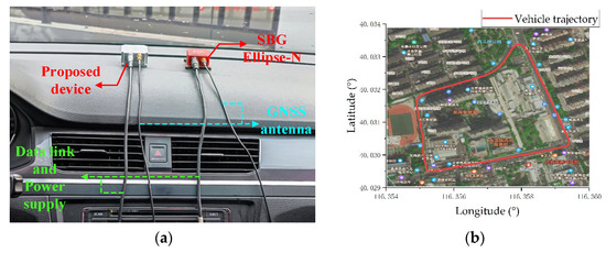 In practical use, the environment is complex and there are many interferences. In order to verify the anti-interference performance and operational effect of the proposed attitude calculation method in a complex environment, the measurement device is fixed inside the test vehicle for practical application tests. The measurement device collects the MARG sensor system data and stores them in the data logger. After the experiment, the information in the data logger is read through the reserved interface, and then the calculation is performed in the PC. In this experiment, the third-generation Ellipse-N product of the French SBG company was used for measurement. The product has a built-in dual-frequency four-constellation GNSS module. Its integrated navigation output attitude angle is used as a reference value. The test environment and the vehicle trajectory recorded by GNSS are shown in Figure 14.