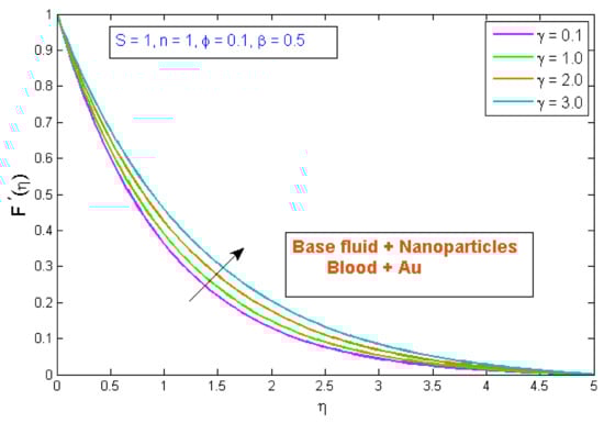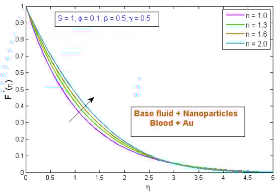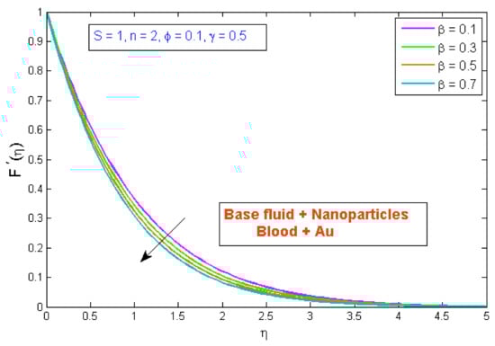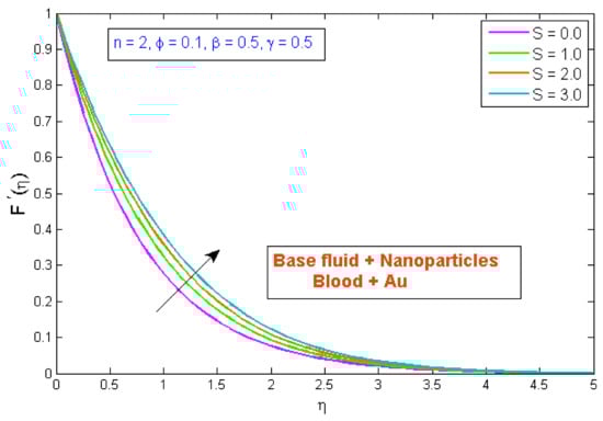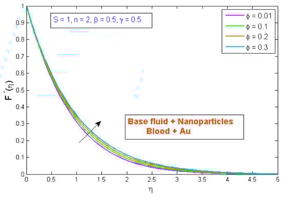 Figure 2 indicates the influence of the volume fraction of gold nanoparticles, , on the velocity profile, . The variation was checked on four different values of , while other parameters were fixed. The outcomes indicated that the velocity profile improved as the gold nanoparticles’ volume fraction increased, implying that utilizing gold nanoparticles can strengthen blood velocity in stenosed arteries. Furthermore, the blood velocity has been shown to be rapid in the center of the vessel and least efficient at the vessel wall. Figure 3 demonstrates the inspiration of the power law index, , on the velocity profile, . It has been perceived that an uptick in the power law index, , causes a growth in velocity. The physical cause for this phenomenon is that shear-thinning fluid encounters less resistance, owing to its poor viscosity, and leads to a rise in the fluid. Figure 4 depicts the behavior of the velocity profile, , for different Sisko fluid material parameter values, S. It was demonstrated that raising the fluid parameter, S, improved the velocity profile. S is described as the viscosity of a high rate of shear to the index of the consistency ratio. Since raising S improves the initial forces of the fluid, resulting in a decrement in viscous forces, a boost in velocity occurs. Figure 5 displays the stimulus of curvature parameter, , on velocity, . This figure shows that the velocity improved with rises in the curvature parameter. It has been determined that as the curvature parameter rises, the velocity field improves because the radius of the curvature declines, thus leading to a reduction in the contact area between the fluid and the cylinder. As a result, the cylinder’s surface offers less resistance to fluid motion. Figure 6 depicts the consequences of the porosity parameter, , on the blood flow velocity profile. The figure shows that as the porosity parameter was increased, the velocity profile diminished. As a result, for a given value of , the velocity reaches an extreme point in the middle of the artery and begins to decrease near the artery’s wall. The velocity profile with the demonstrated this behavior, which may be due to the fact that as the fraction of void volume over total volume is boosted, fluid movement in the artery becomes incredibly hard. As a result, as improved, the velocity through a porous stenosed artery was reduced.