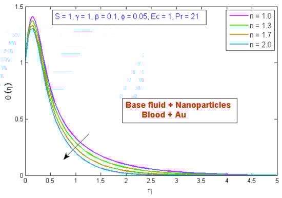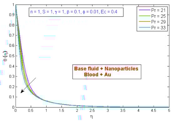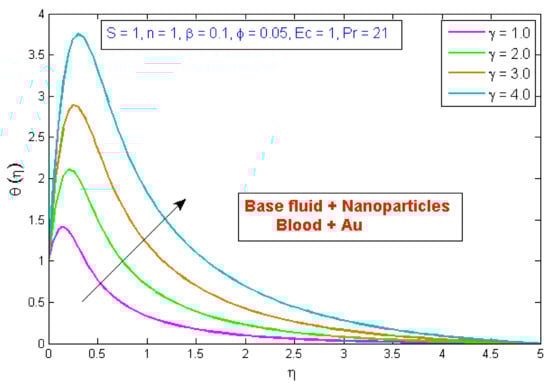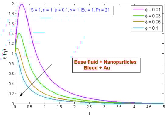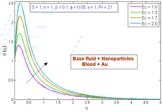 Figure 7 depicts the effect of the volume fraction of gold nanoparticles on the temperature profile, . The graph shows that boosting the nanofluid volume fraction, , reduced temperature. This reduction is due to gold nanoparticles’ high thermal conductivity, which plays a significant role in rapidly dissipating temperature. Figure 8 demonstrates the stimulus of the power law index, , on the temperature profile, . The physical cause for this phenomenon is that shear-thinning fluid encounters less resistance owing to its poor viscosity, thus resulting in augmented fluid velocity and diminished fluid temperature. Figure 9 describes the consequence of the curvature parameter, , on temperature distribution, revealing that temperature demonstrates an inciting trend via . An uptick in diminishes the surface link area of the liquid particles, resulting in less opposition and an upswing in velocity. Since the Kelvin temperature is described by average kinetic energy, the temperature rises. Figure 10 depicts the effect of the temperature profile, , versus the Prandtl number, . It can be seen that as upturned, the temperature of the fluid decreased. This is because the thermal boundary thickness was reduced as the grew. This signifies that an uptick in is related to an upsurge in the heat transfer rate at the blood arterial wall. When blood has an advanced , its thermal conductivity declines; thus, its capacity for heat conduction is significantly reduced, and the fluid temperature is reduced. Figure 11 portrays the disparity in fluid temperature caused by fluctuations in the Eckert number, . The graph shows that as the value of upswung, so did the fluid temperature. Because of frictional heating, heat was created in the fluid as the value of upsurged. is usually physically defined as the ratio of kinetic energy to the specific enthalpy variance between the wall and the fluid. Consequently, an upsurge in the findings in the conversion of kinetic energy into internal energy via work was conducted against viscous fluid stresses. Therefore, raising the resulted in an upsurge of the fluid temperature.