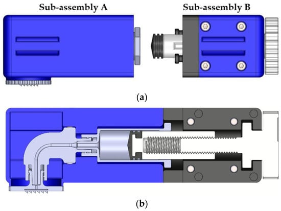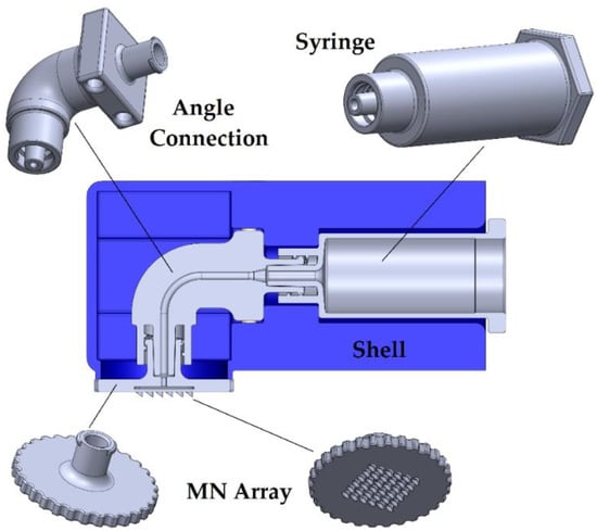 Sub-assembly A consists of four custom-designed parts as illustrated in Figure 2 as well as two standard M3×35 Allen screws and two simple M3 nuts. The part “Shell”, which is visible from the outside of the device, contains special configurations and cavities to connect with it the neighboring parts. Its dimensions are 40 × 40 × 80 mm. Externally, there are slots through which Velcro straps can pass to mount the device on the arm. Inside the “Shell”, a cavity exists to nest the “Angle Connection” corner connection. The “Angle Connection” contains at each end a standard Luer lock thread, so that it can be connected on one side with the syringe and on the other side with the microneedle array (“MN Array”). The lower thread of the angle connector is male Luer lock, and the upper is female. Respectively, the “MN Array” has female threads, whereas the syringe has male threads. The link is also visible along with the internal channel, which has a diameter of 1 mm for the active drug to pass through.