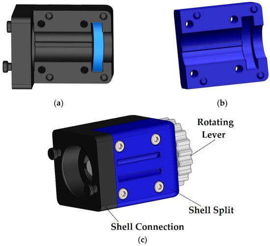 Figure 3. (a) General view of “Shell Connection” with marked surfaces for mounting cylinder; (b) general view of “Shell Split”; (c) view of “Shell Connection”, “Shell Split”, and “Rotating Lever”.