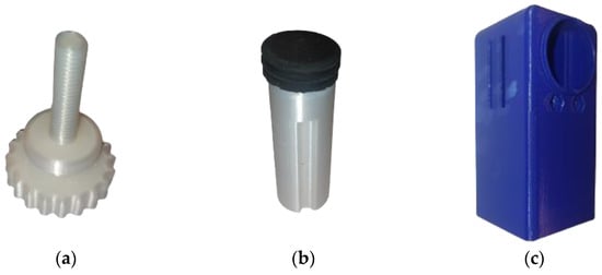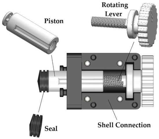 To implement this property, a mechanism was selected that converts the rotational motion imposed by the user into a linear one as shown in Figure 4. More specifically, the part that will carry the rubber seal on its front has internally, almost along its entire length, a female thread (“Piston”) that is counterclockwise. In addition, the piston has a special configuration at the front so that it can apply the sealing element, which is standardized by a 12 mL Luer Lock syringe.