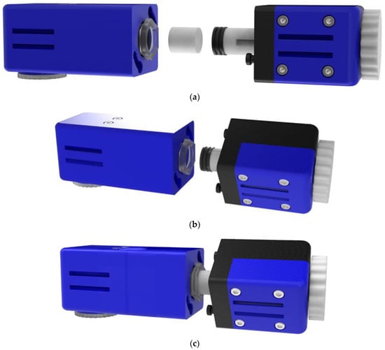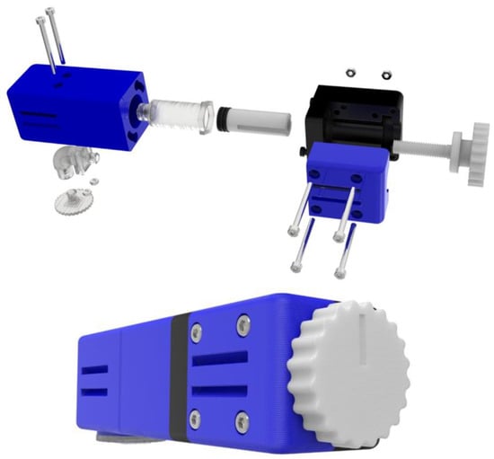 Its internal dimension has a diameter of 15 mm, a standard syringe of 12 mL, a path length of about 35 mm, and a wall thickness of 0.8 mm. Screwing can be done by hand, as it has a hexagon on the back for convenience and the screwing is complete when the surface of the front of “Syringe” is in contact with the configuration of the “Shell” part. Sub-assembly B consists of four designed parts and four M3 Allen screws plus their nuts. The “Shell Connection” connects the two sub-assemblies. To assemble this layout, a “Rotating Lever” is inserted into the unique cylindrical arrangement, followed by the “Shell Split,” which is placed in the “Shell Connection” corresponding holes through its four pins as shown in Figure 3. The pins are necessary to align the exterior surfaces of the A and B sub-assemblies. The connection is then secured using four Allen M3 screws that pass through the “Shell Split” and have their upper surface aligned with the part’s outer surface with grooves. In the “Shell Connection”, hexagonal pockets are provided for the nuts. This allows for the screws to be tightened with a simple Allen wrench. The reason for the two divided sections is that the cylindrical part of the “Rotating Lever” should not move axially and is thus trapped inside the particular case in which it rests. For the optimum fit of the parts and given the construction possibilities and defects, there is an axial grace of about 0.5 mm between the “Connection Shell” and the “Shell Split”, so that they do not rub against the “Rotating Lever” and make rotation difficult.