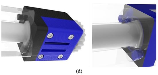 Figure 5. (a) Functional illustration of the mechanism and placement of the gel containing the active substance; (b) preparation for connection of A and B sub-assemblies; (c) pins joining with the cylindrical sockets and coincidence of the surfaces of the two parts; (d) rotation and lock of mechanism.