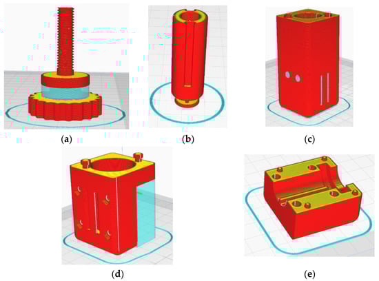 Figure 7. Print simulation in Cura of: (a) Rotating Lever; (b) Piston with seal; (c) Shell; (d) Shell Connection; (e) Shell Split.