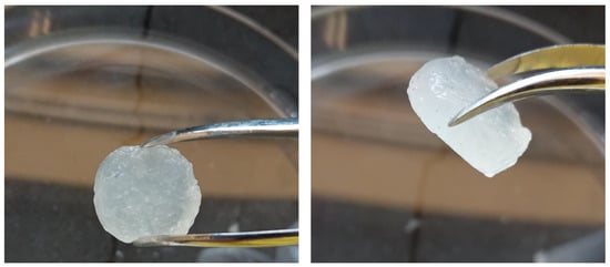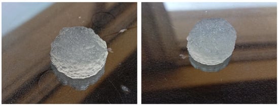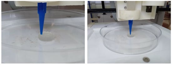 Sodium alginate hydrogels were selected as a model mechanoresponsive [28] material. These hydrogels are composed of a continuous three-dimensional polymeric matrix and an aqueous phase. The mechanoresponsive nature of these gels renders them able to release part of the aqueous phase upon mechanical stimulation without compromising their structure (for low applied external force). To perform in this mechanoresponsive way, these gels should be partially crosslinked to be able to be printed, and subsequently they should be fully crosslinked to become solid. These solid forms are expected to release only part of their aqueous phase (aqueous solutions) suitable for injection. Such a system can be the drug loading carriers. The 3D printing of sodium alginate gels was performed according to the literature, with modification [29,30]. Briefly, 5 mL of a 4% w/v aqueous solution of sodium alginate (Sigma Aldrich®, Merck KGaA, Darmstadt, Germany) was mixed with 0.4 mL of 10% w/v aqueous solution of calcium chloride (Sigma Aldrich®, Merck KGaA, Darmstadt, Germany) to form a viscous printable gel. Cylinders were subsequently printed by an extrusion-based 3D printer (CELLINK® Inkredible, Gothenburg, Sweden). The diameter of the 3D printed semi-solid cylinder can vary accordingly to the dimensions of the microneedle device barrel. The cylinders were submerged by a 10% w/v aqueous solution of calcium chloride for 5 min to be crosslinked and become free-standing, as illustrated in Figure 9, Figure 10 and Figure 11.