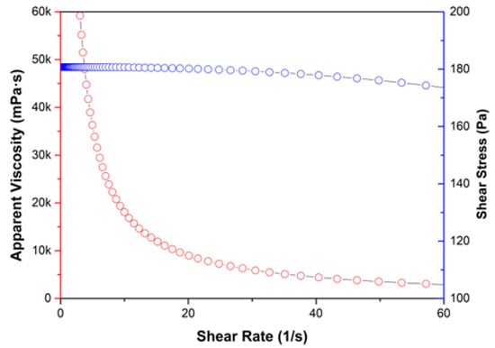 Figure 12. Apparent viscosity and shear stress vs. shear rate plot of the 3D printable sodium alginate gel (3D printing ink).