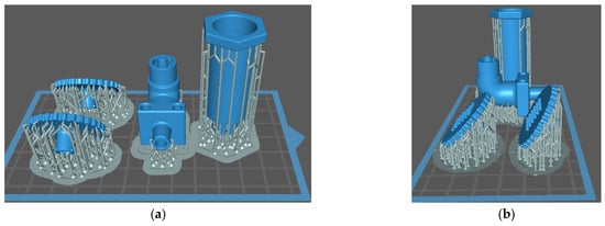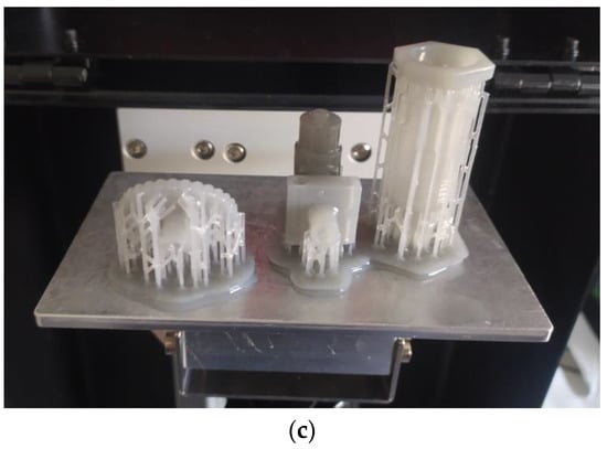 Figure 13. (a,b) Front and side views of the placement of the parts on the platform with the supports; (c) 3D printed components with the platform facing upwards.