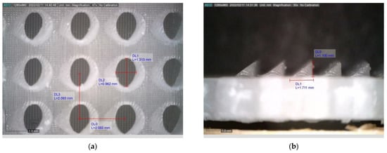 Figure 14. (a) Top view and (b) side view of the microneedles 3D printed with a liquid crystal display technique.