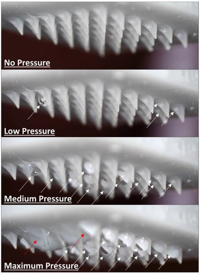 Figure 15 shows the injection liquid as it is exerted from the microneedle array at three different pressure levels applied by the device (low, medium, and maximum pressure, respectively). Low pressure is defined as the minimum applied pressure needed for the formation of a distinct droplet by the exerted liquid from the microneedles (white arrows). Maximum pressure, in contrast, is defined as the maximum pressure that can be applied by the device to the crosslinked alginate gel. After the application of the maximum pressure, the gel is fully collapsed and the maximum amount of the injection medium is considered to be released from the 3D printed gel structure. Finally, medium pressure is defined as an intermediate pressure level between low and maximum pressure. Figure 15 shows the gradual formation of distinct droplets during pressure increase (white arrows). At low pressure, the droplets are visible at individual microneedles. At intermediate pressure (medium pressure), droplets are visible at most of the microneedles, whereas at maximum pressure, the liquid droplets coalesce toward the formation of a continuous superficial liquid film (red arrow) that covers multiple microneedles. This behavior is expected as the microneedle array is exposed to air. When the array is inserted in a substrate (skin), there would be no coalescence present in the system during the injection [20].