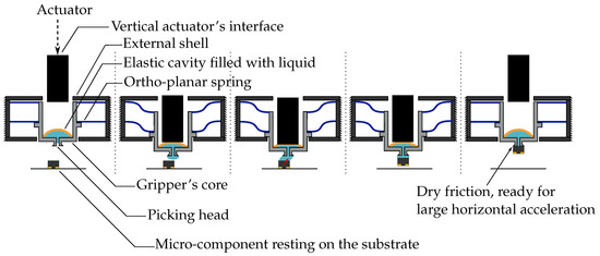 Even though these grippers have not been designed with this transport issue in mind (most of the time, they are aimed at changing the intensities of the capillary forces for the release of the components), the literature provides us with leads and objects of reflection to create a gripper optimized for the lateral transport phase. The tuning of the capillary forces can be obtained by monitoring the wettability. For instance, capillary forces can be tuned thanks to the electro-wetting effect [7,8,9]. A gripper made of a rough elastic membrane able to modify its wettability by stretching was proposed by Fantoni et al. [10]. Based on Israelachvili’s model [11], Biganzoli et al. [12] and Pagano et al. [13] investigated the changes in conformity of their grippers thanks to inflatable membranes, distorting their grippers from flat to hemispherical. Such mechanisms allow decreasing the gripping forces and, therefore, releasing the picked objects. Iazzolino et al. [14] have shown that the tuning of the capillary forces can be obtained by tuning the volume of the liquid meniscus. In this case, the objective is the release by evaporation, based on a change in the contact conformity that decreases the capillary forces. Lambert et al. [15], in whose work the conical cavity of the gripper was used to generate larger capillary forces, also exploited the conformity concept and enhanced the gripping capabilities. In addition to being a limitation during transportation, the presence of a liquid layer is also an issue in two other situations: