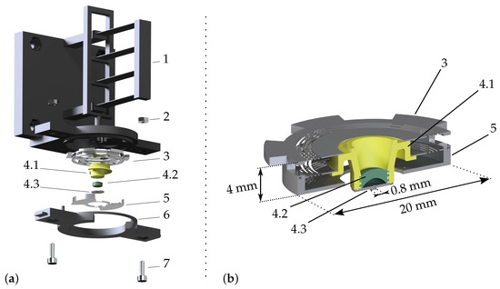 CAD representation of the manufactured parts. (a) Exploded view of the system with the order of assembly. The gripper’s core (the body 4.1 in which the cavity 4.2 was molded and closed by the micro-metric picking head 4.3) was assembled with the monolithic parallel ortho-planar springs 3 and enclosed by the lower stops 5. The system was sealed by screwing the lower casing 7 on the interface 1. (b) Cut view of the gripper’s core (4.1, 4.2, 4.3) attached to the ortho-planar springs 3 and the lower stops 5.