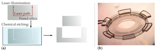 Manufacturing of the fused silica parts 3, 4.3, and 5 was performed by means of a femtosecond laser-assisted chemical etching process. The laser was used to locally illuminate the glass. This operation alters the material, which becomes more easily etchable in acids or bases (typically highly concentrated hydrofluoric acid or potassium hydroxide solutions). By illuminating complete areas, blocks of fused silica can be detached in order to produce the desired part. Figure 4a illustrates the laser illumination and etching processes.