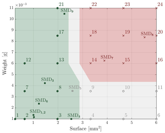 Results of the picking tests. Fused silica components (numbered from 1 to 24) and surface-mounted devices (numbered from SMD to SMD) of varying surfaces and weights were tested. The green area represents a successful picking and self-alignment. In the gray area, the picking occurred but the self-alignment did not. The red area codes for the failure of both the self-alignment and the picking.