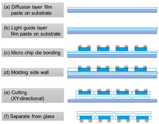 Figure 2 presents the WA square mini-LED chips’ scale packaging process [44]. The first step in the packaging process involved depositing a diffusion layer on a glass substrate. The source material’s composition was 5% titanium dioxide (TiO2) particles and 95% silicone resin composite glue, with a refractive index of ~1.56. The silicone resin used was Dow Corning OE-7662, and the refractive index of silicone resin is 1.55.