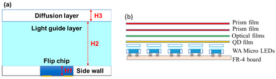An epoxy glass fiber unclad laminate (FR4) board was used as a flexible circuit board, and its length, width, and thickness were 131.2, 67.2 and 0.4 mm, respectively. The active area of the sample was 127.2 × 63.2 mm2, and the pitch was 0.80 mm. A total of 3200 packaged WA mini-LEDs were mounted in an array onto a flexible FR4 board, as shown in Figure 4a. The sidewall of the resin is wrapped around the chip, and the reflectivity of the resin is 92%. Figure 4b details the structure of the backlight unit consisting of 80 × 40 arrays of square-shaped packaged WA mini-LEDs, with a QD film, optical film, and prism film. The optical film and prism film used 3M TBEF2 and UDF2-35, respectively. All of these features combined produce an ultrathin, flat, and uniform light source. Each layer of optical film was stacked in sequence, with minimal air spacing between each layer [44].
