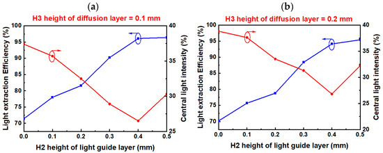 The height of the diffusion layer (H3) was initially fixed at 0.1 mm. Without a light-guide layer, the light extraction efficiency and central light intensity were 71.4% and 37.4%, respectively. When the height of the light-guide layer (H2) was increased from 0.1 to 0.4 mm, the light extraction efficiency was observed to increase from 78% to 96.1%, whereas the central light intensity decreased from 35.7% to 26.5%, as shown in Figure 5a.