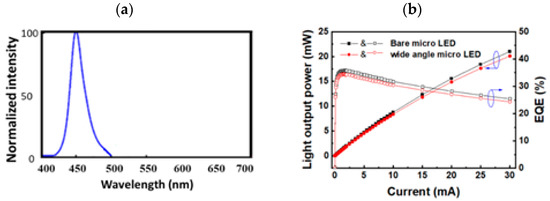 Figure 6a presents the spectrum of the WA mini-LED’s wavelength versus the normalized intensity. Figure 6b presents the measured light-current (L-I) and external quantum efficiency (EQE) characteristics for a bare mini-LED and the packaged WA mini-LED. The light output power of the two LEDs was only slightly different, with the packaged WA mini-LED experiencing a 4.20% deterioration in light output power compared to the bare mini-LED at an injection current of 15 mA. The light loss of the WA mini-LED was attributed to the addition of a diffusion layer on top of the light-guide layer, causing some light to be absorbed.