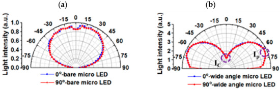 Figure 7 display the 2D light distribution patterns of the bare mini-LED and the packaged WA mini-LED at an injection current of 10 mA. The bare mini-LED and packaged WA mini-LED viewing angles were measured to be 147° and 180°, respectively.