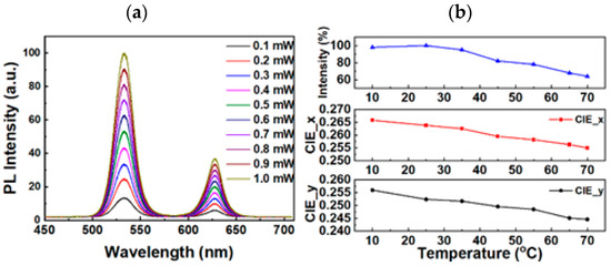 The photoluminescence (PL) intensities of QD films were tested at different laser excitation powers, using a 365 nm laser. Figure 8a displays the laser-excitation-power-dependent PL spectra of the QD films. The positions of their peak wavelengths at full width at half maximum (FWHM) were almost the same across the range of excitation powers from 0.1–1.0 mW, indicating that these peaks were relatively stable under different laser excitation powers. Two excitation bands were observed with peaks at 532 and 626 nm. The FWHM values corresponding to these peaks were 24.4 and 23.2 nm, respectively. The two International Commission on Illumination (CIE) color coordinates x and y as functions of temperature were measured from 10 to 70 °C, with respect to the relative PL intensity values. These results are depicted in Figure 8b. As the temperature increased, the observed relative PL intensity value decreased, and a slight but distinguishable progressive blue shift of the two CIE color coordinates x and y was observed.