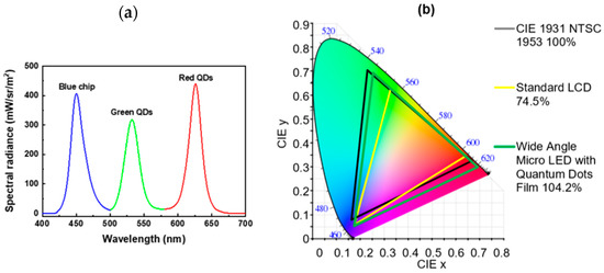 - Guo, W.; Chen, N.; Lu, H.; Su, C.W.; Lin, Y.; Chen, G.; Lu, Y.; Zheng, L.L.; Peng, Z.B.; Kuo, H.C.; et al. The impact of luminous properties of red, green, and blue mini-LEDs on the color gamut. IEEE Trans. Electron. Devices 2019, 66, 2263–2268. [Google Scholar] [CrossRef]