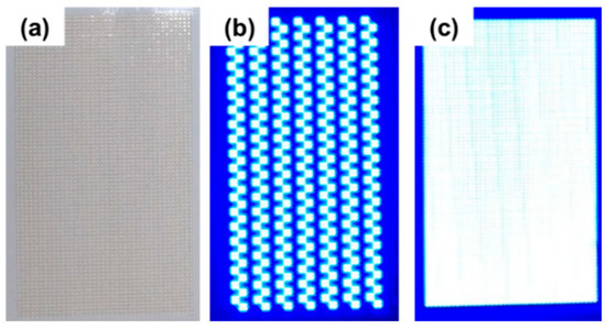 Figure 10a presents the 3200-piece WA mini-LED flexible planar backlight module. A Yongtek Electronics die bonder was used to complete the process. Figure 10b presents an image from the local dimming function that was obtained by using a driver integrated circuit to control the mini-LEDs in specific areas. Figure 10c shows an image of the model when all the mini-LEDs were activated. This model had an operational voltage of 96.2 V, an operational current of 0.015 A, and a power consumption of 1.44 W.