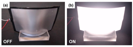 Table 2 shows the luminance values of the display at different bending diameters. For bending diameters from 130 to 100 mm, the voltage had minimal variations when a 0.015 A current was applied. A decrease in brightness of only 2.57% was observed. Thus, the display is suitable for flexible display applications.