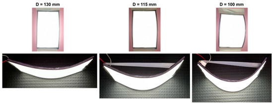 Figure 12 demonstrates that the wide-angle micro-LED flexible planar QLED display had satisfactory performance metrics when bent to different curvatures. The bending diameters of the display ranged from 130 to 100 mm. The brightness uniformity was not affected by the bending curvature.