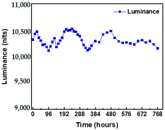 Figure 13 displays the burn-in test results for the WA mini-LED flexible planar QLED backlight. During the 768 h test, the display was placed on a platform at 25 °C, and a 0.015 A current was applied. The resulting luminance values were consistently greater than 10,000 nits. The attenuation was 0.16% after 168 h and 1.6% after 768 h. These results indicate that the display is reliable.