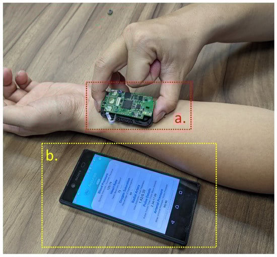 A patient that has been measured. (a) The cuffless BP monitor. (b) A smartphone displaying the patient’s BP data and recording.