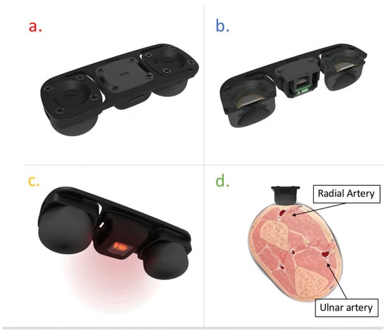 The cuffless BP monitor uses a multi-sensing module that integrates piezoelectric and optical sensors. (a) Top view. (b) Side view. (c) Bottom view. (d) The sensor module must be placed parallel above the radial artery.