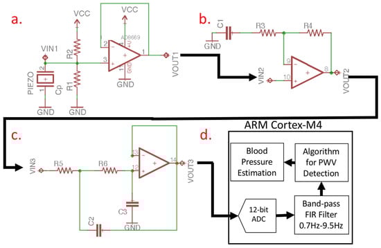 Topology of the AFE on the motherboard. (a) The voltage follower (VF). (b) The signal amplifier. (c) The second-order Sallen–Key low-pass filter (LPF). (d) The ARM Cortex-M4.