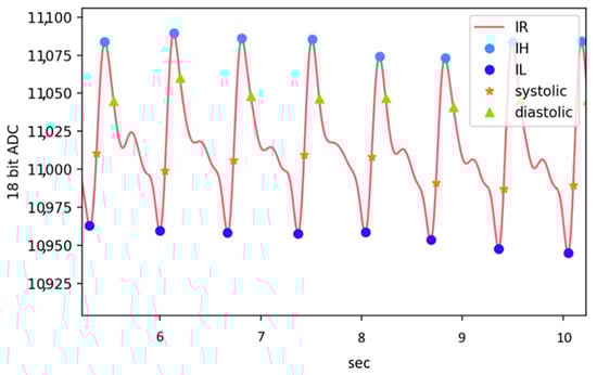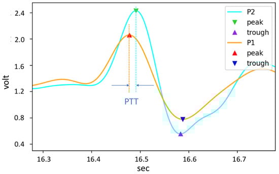 The 12-bit ADC of the motherboard samples the pulse wave signal of the AFE at a sampling rate of 5 kHz and uses the finite impulse response (FIR) to filter the signal [33]. The FIR filter algorithm we use is a band pass filter (BPF), where the cut-off frequency for high-pass filtering is 0.7 Hz and the cut-off frequency for low-pass filtering is 9.5 Hz [34]. After the pulse wave signal is pre-processed by digital filtering, the dynamic threshold algorithm can effectively detect the characteristic points of the pulse wave, as shown in Figure 6. Finally, the PTT (inversely proportional to PWV) can be obtained by calculating the pulse wave time difference between two positions of arterial segments [35].