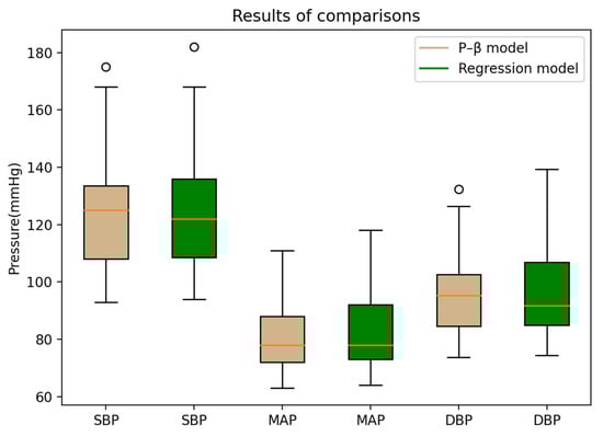 Figure 9 presents the two cuffless BP estimation models applied to the distribution of BP statistics of the same participants. The regression model has a more significant measurement dispersion, and the maximum value is also significantly higher than that of the P–β model.
